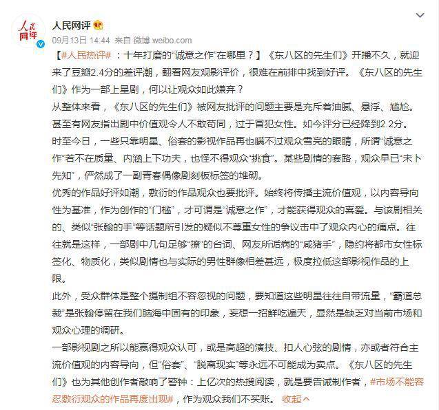 它直接質問這部劇的劇組人員「十年打磨的誠意到底在哪里」,甚至還點名嚴厲的批評了劇中這種「謀福利」現象。