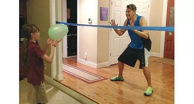 每個人將氣球綁在兩只腳裸處相互踩,父母與孩子在這樣的氛圍中增加了融治感。