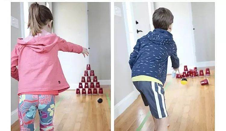也可以設置成投保球的場景,兩邊畫線形成木板道,將家里不用的啤酒、塑料杯利用起來擺成陣型。