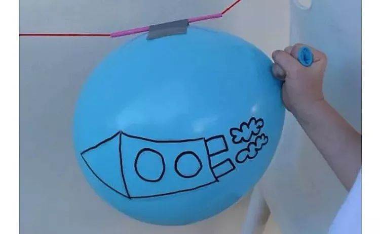 利用在釋放氣球氣體時所產生的沖力來指導小朋友完成火箭的制作。
