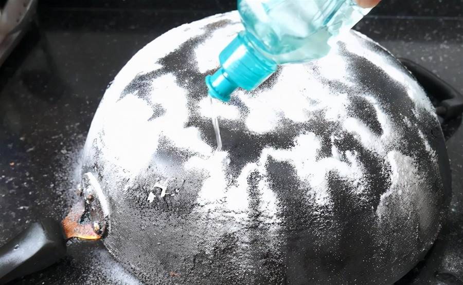 我們將炒鍋的鍋底朝上放置,在鍋底有黑垢的地方撒上一些小蘇打,小蘇打有很強的去污效果,能夠強力去污分解油垢,再擠上一些洗潔精就可以了。