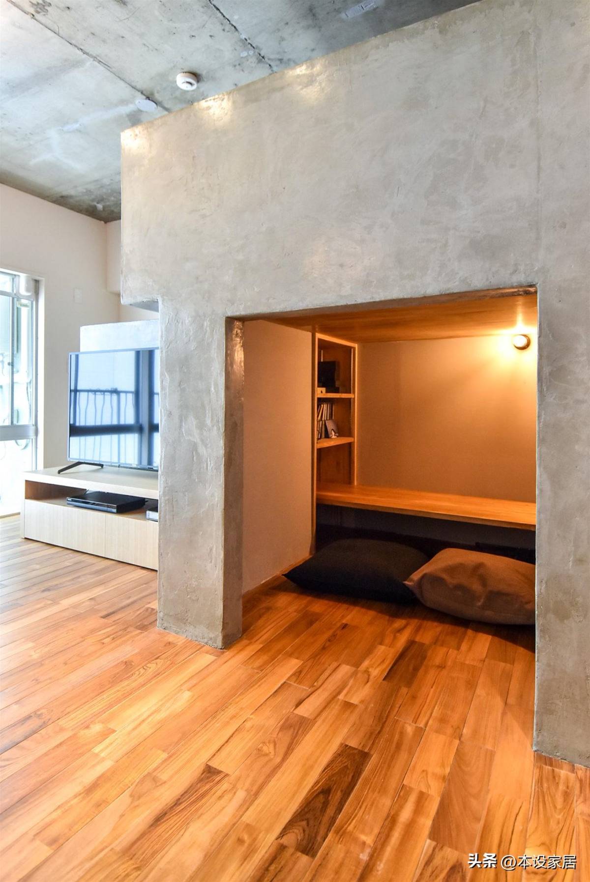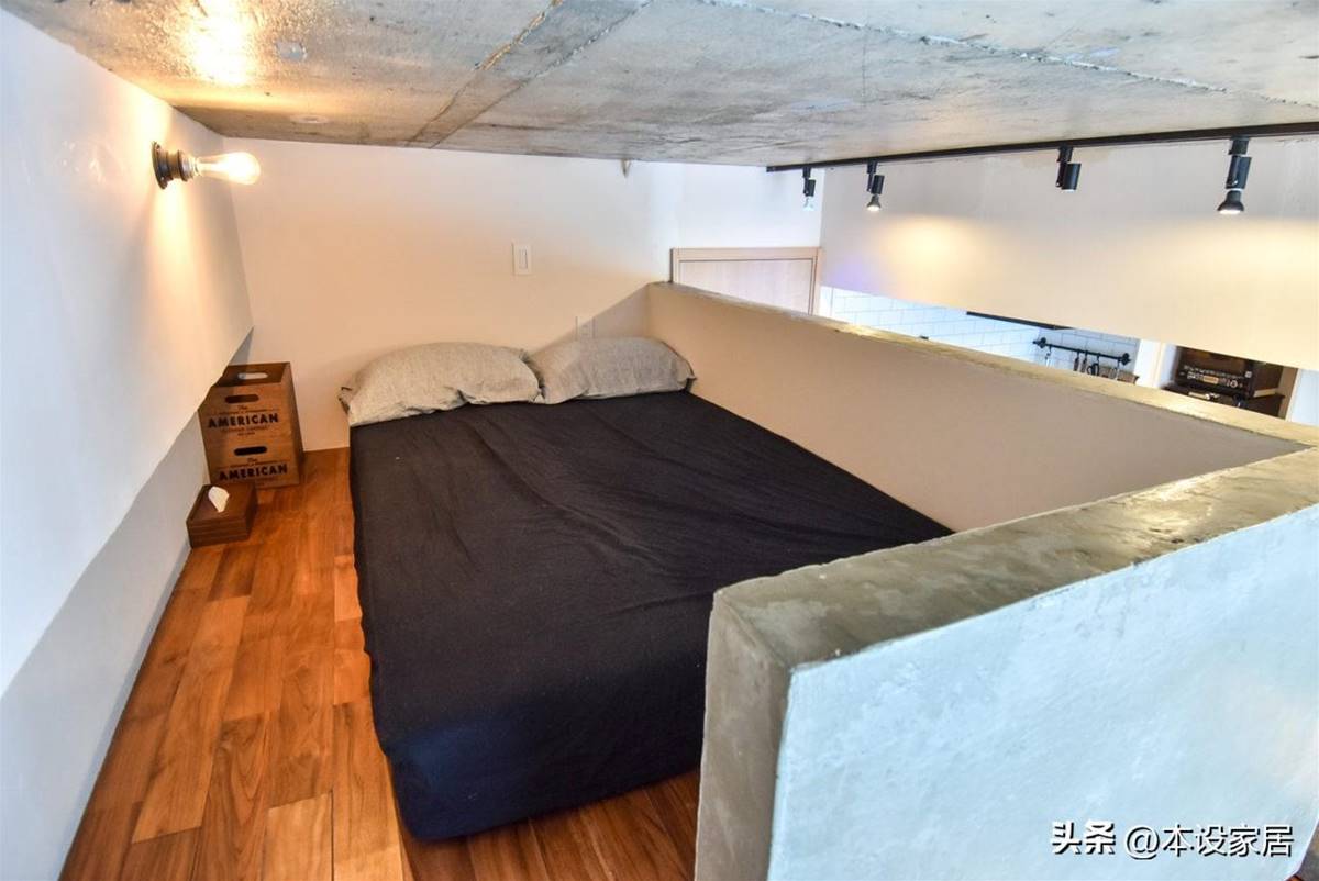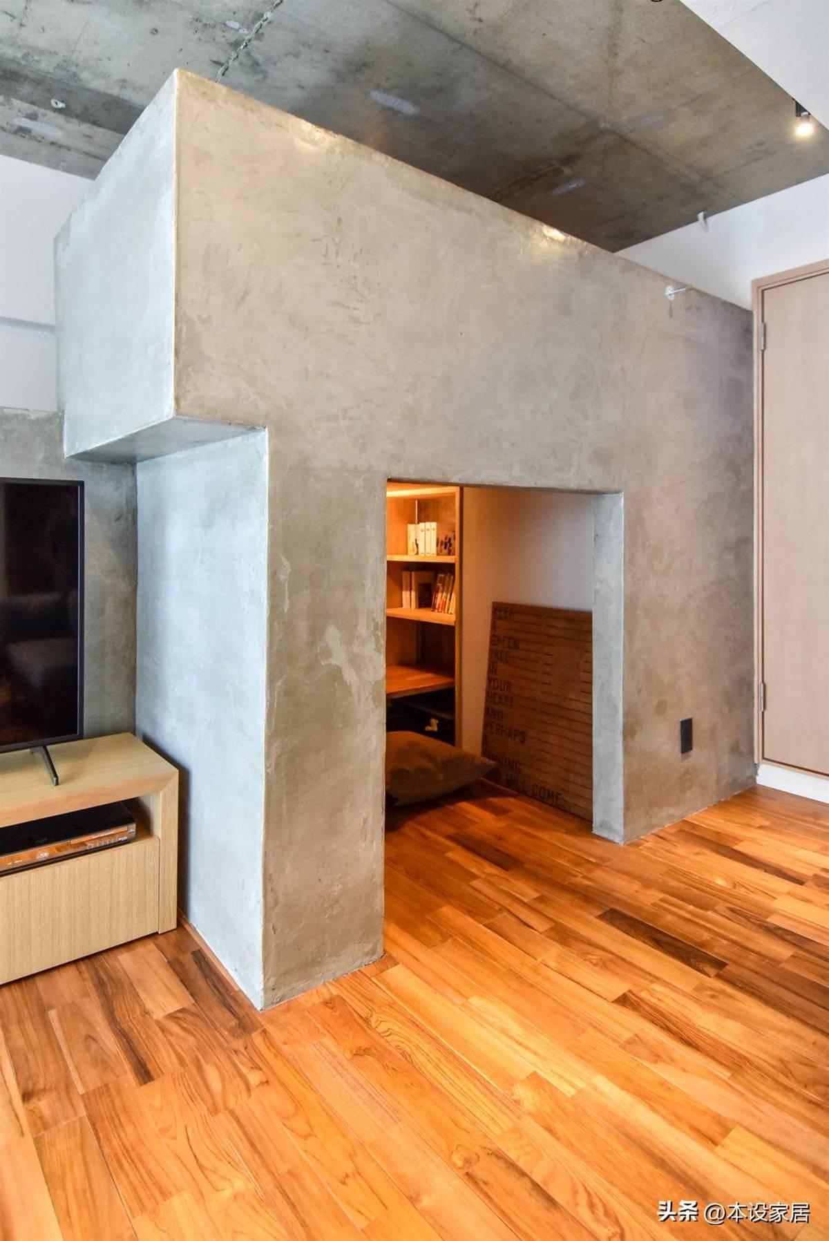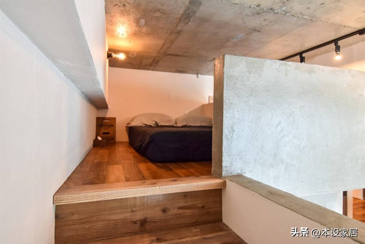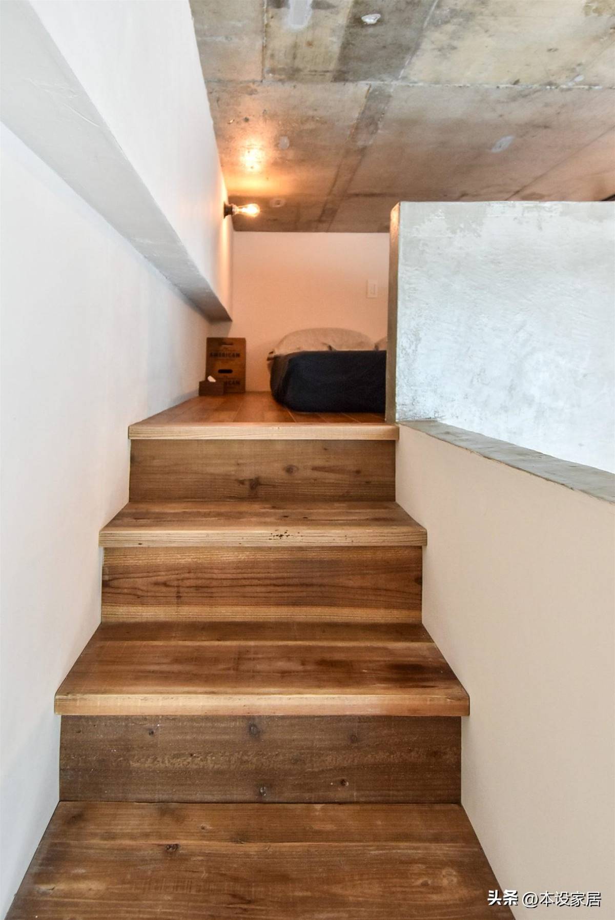 而樓梯剛好隱藏在電視背景墻后面,刷灰色水泥漆,一直延伸到臥室的隔墻。