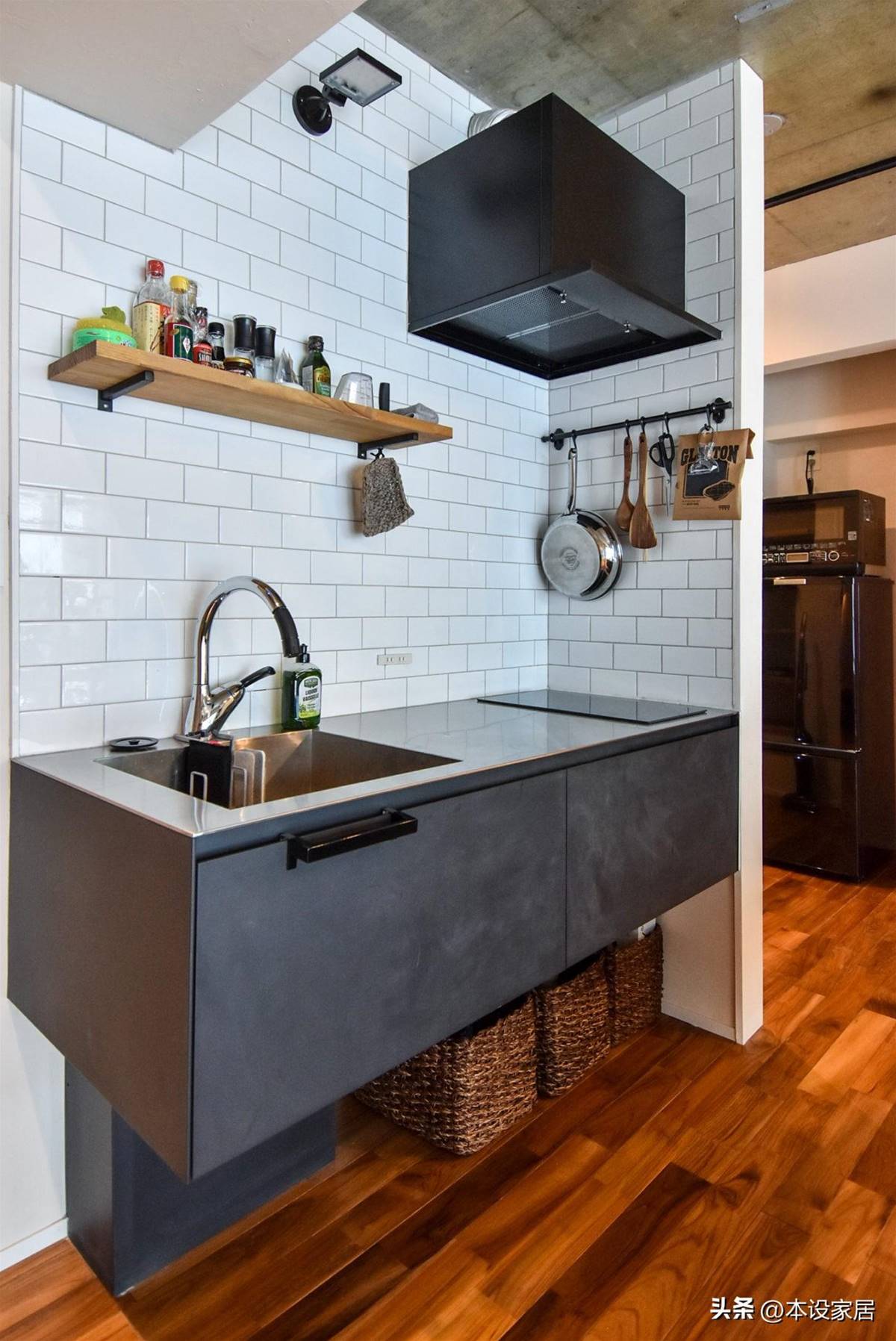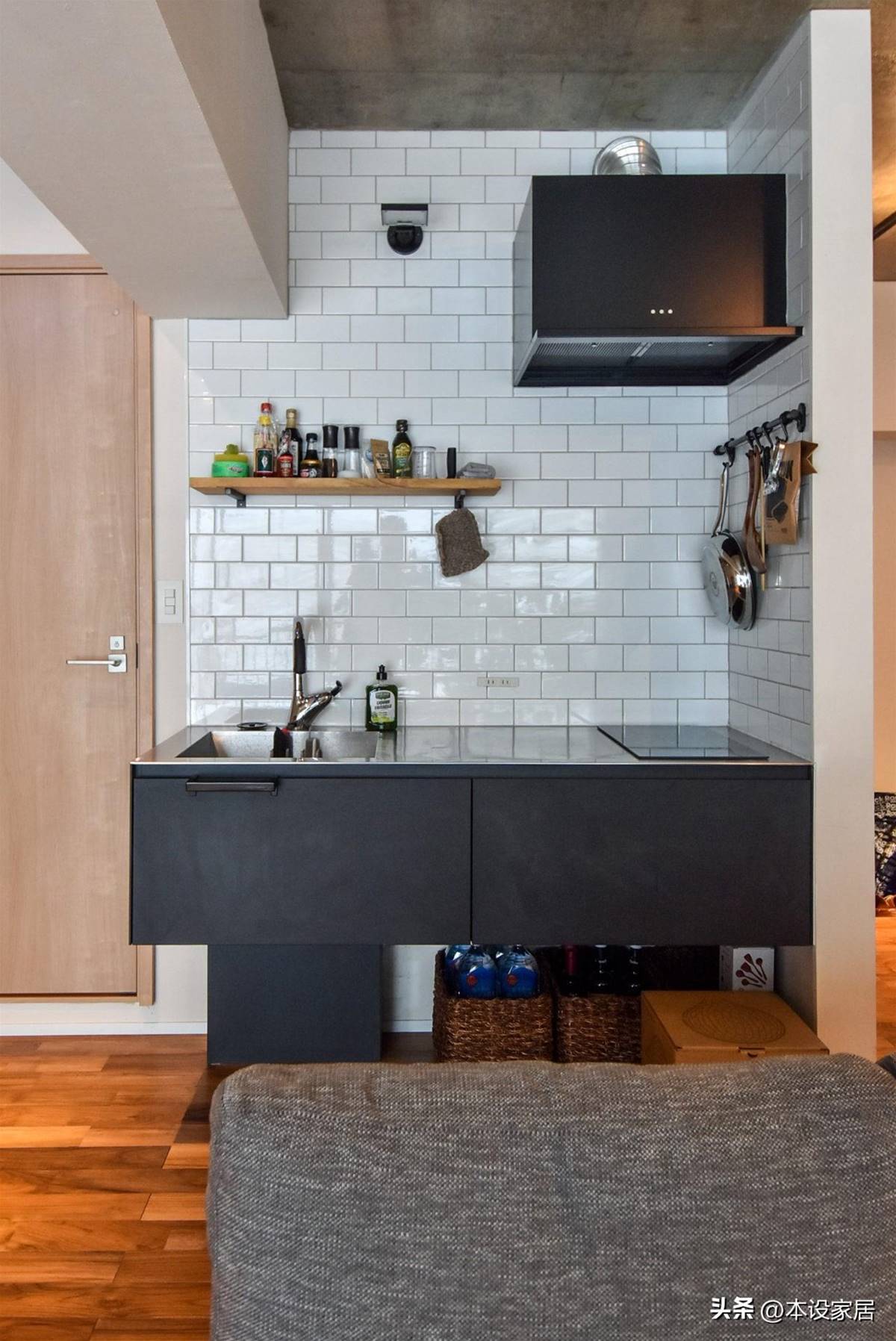 開放式廚房布置在沙發背面,由一個小水槽和一個電磁爐組成,一個人的生活簡單明了,只要有個能做兩道菜的地方就足夠了,清潔也方便。