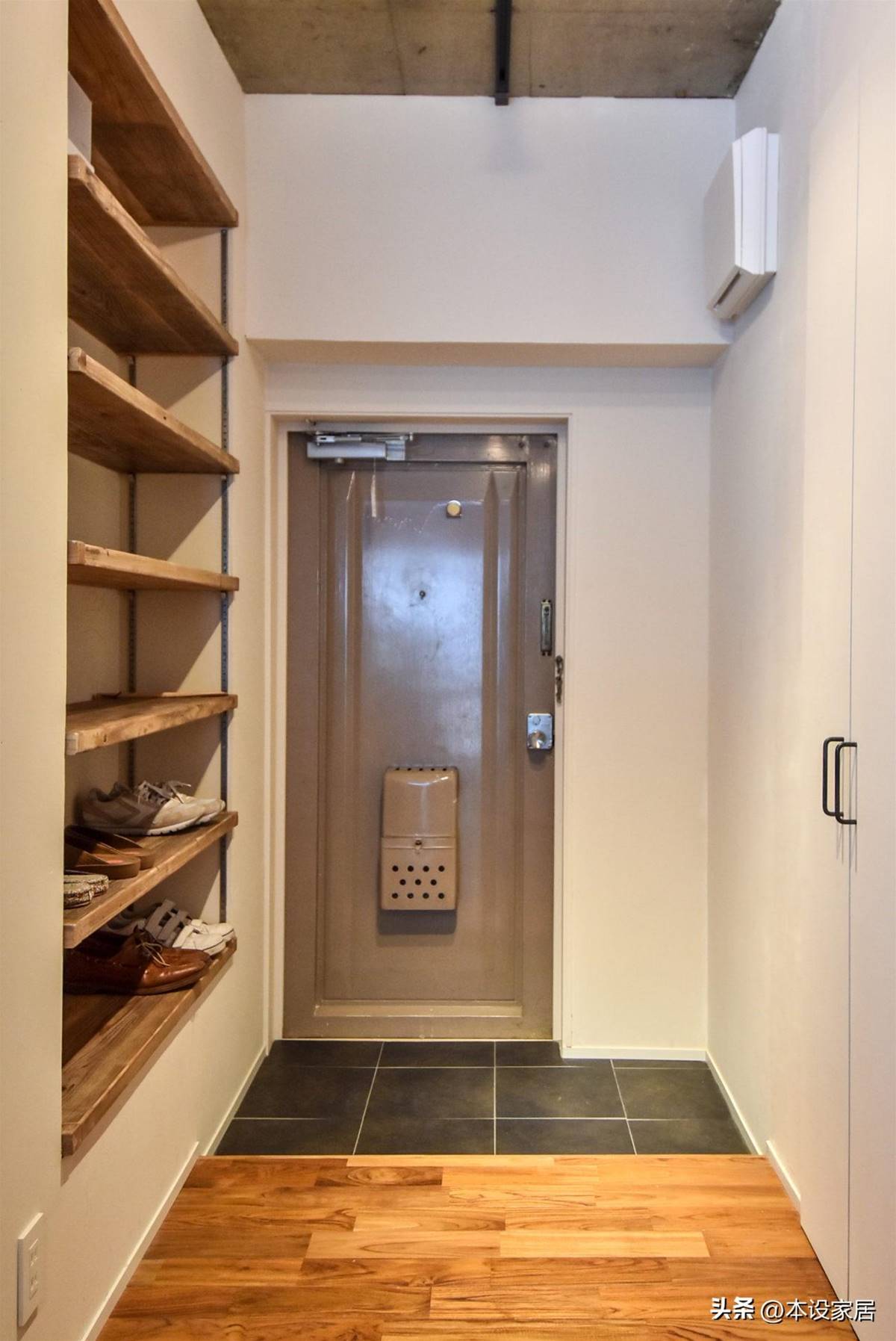 入住后,小哥堅持一天一收拾,小小的玄關地面鋪設深灰色磚,一塵不染。左邊的墻面安裝了六層鞋架,把日常所穿的鞋靴有序地收納到其中,一目了然,非常舒適,而整體的白色調,讓小房間顯得更加寬敞有序,留白感極強。