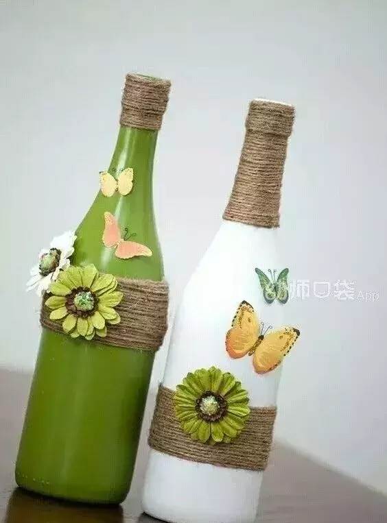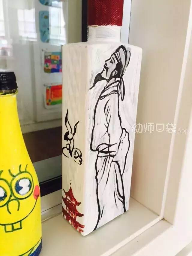過年一定喝酒了~白酒瓶、紅酒瓶家家少不了。酒喝光,酒瓶也是環創的一大法寶。用丙烯顏料手繪裝飾酒瓶。