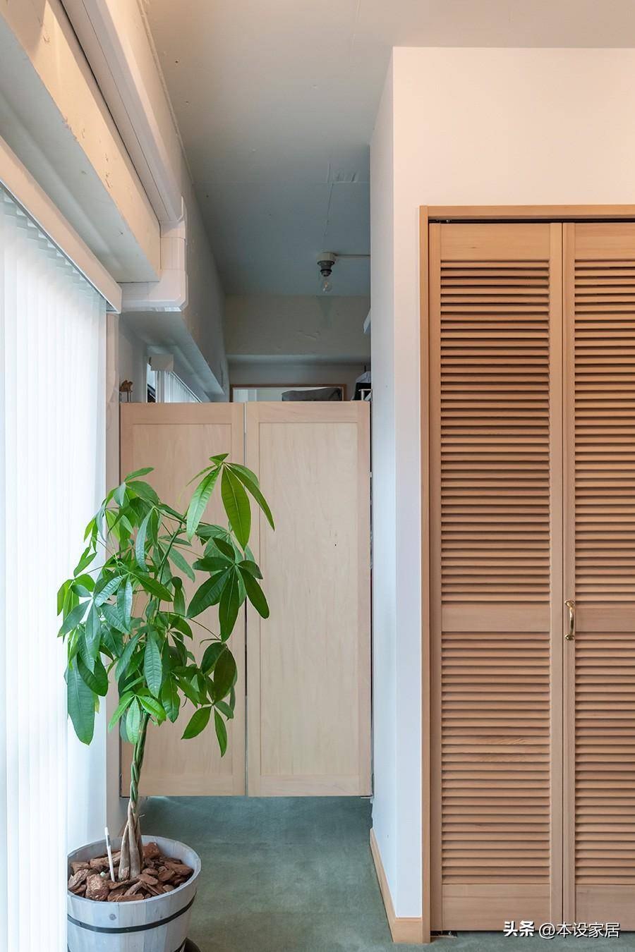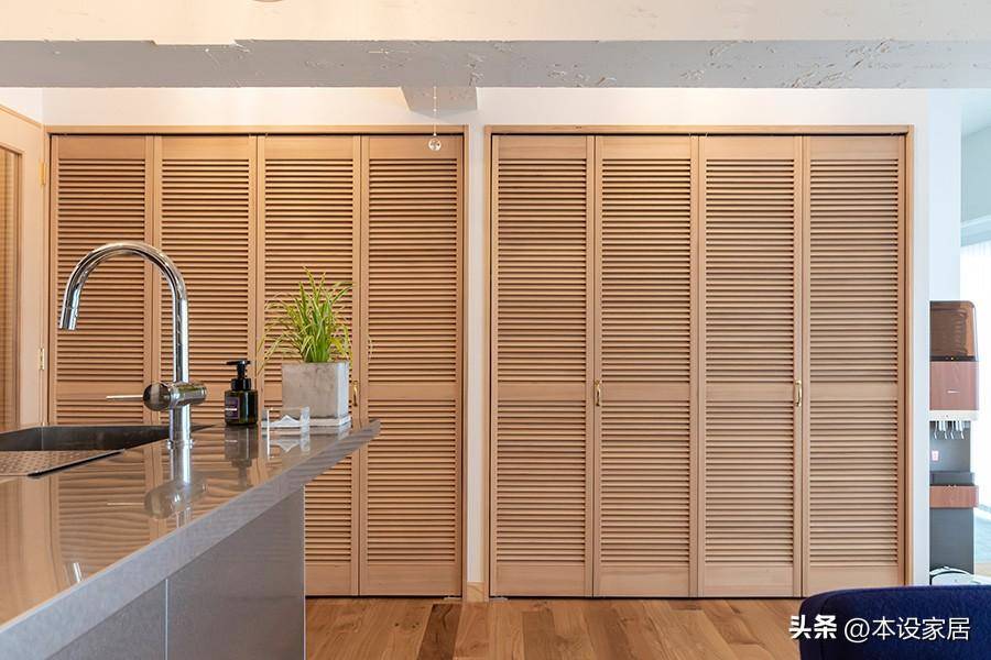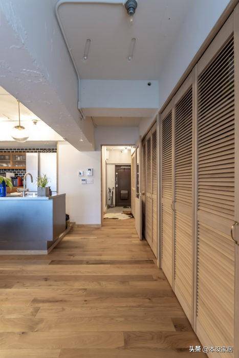 要想擁有一個干凈整潔的家居環境,儲物空間必不可少,阿姨定制了一組從玄關延伸到起居室的木質百葉窗櫥柜,日常生活用品有序地納入其中,不干凈都難。
