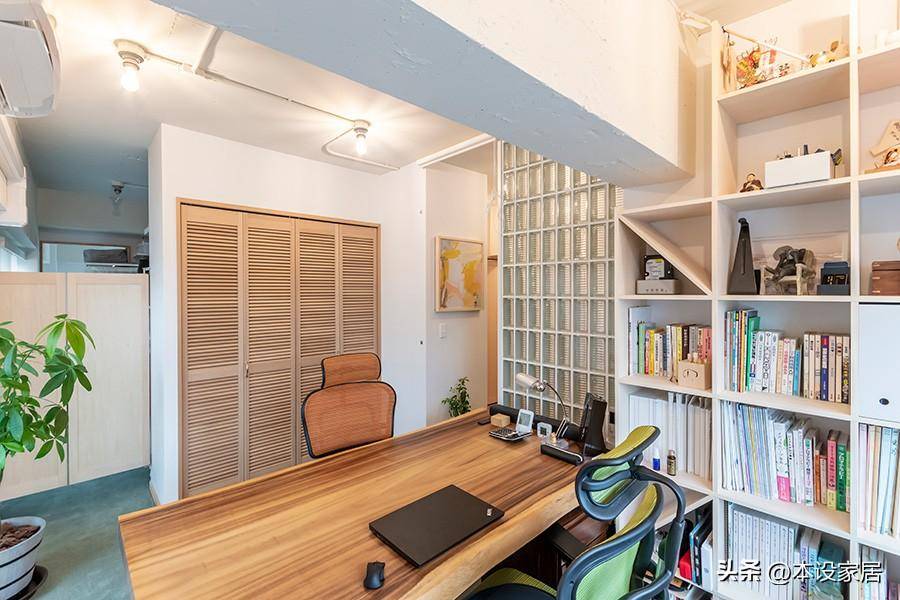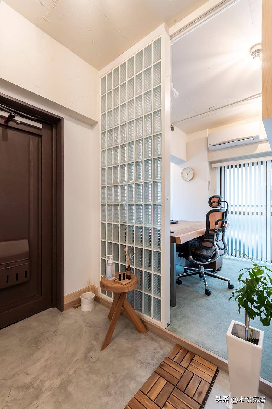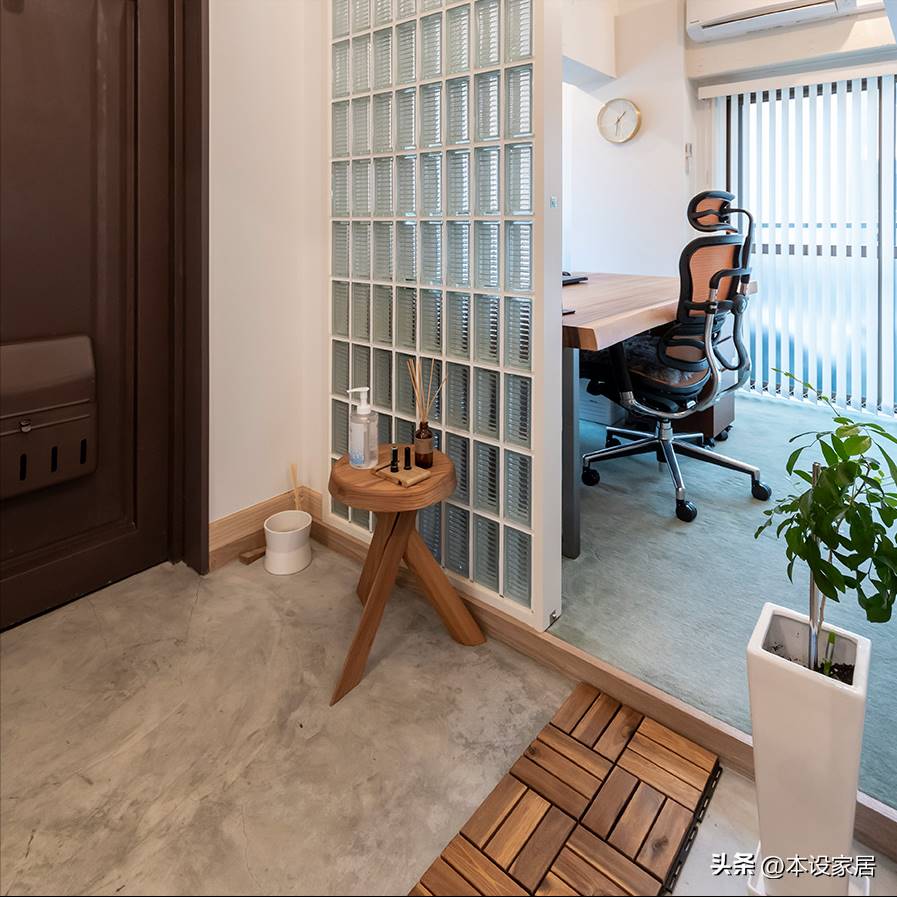 書房布置在玄關旁邊,沒有門,局部用玻璃磚做隔斷,擋住視線,卻不擋光線。