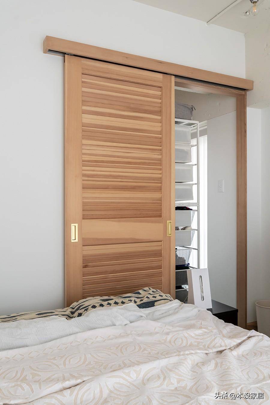 臥室布置比較簡單,木地板、大白墻,一個寬松、靜謐的環境,才是提供良好睡眠的根本原因。臥室自帶衣帽間,利用隔板和收納盒儲物,也能省不少費用。