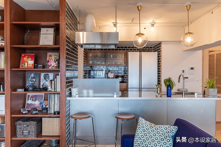 開放式廚房墻面貼深灰色磚,操作台采用一體化的不銹鋼材質和實木櫥柜,美觀又好打理。每天用餐后,都會使用清潔劑或濕紙巾將灶台從上上下下全部擦一遍,所以幾乎看不到油煙的存在。