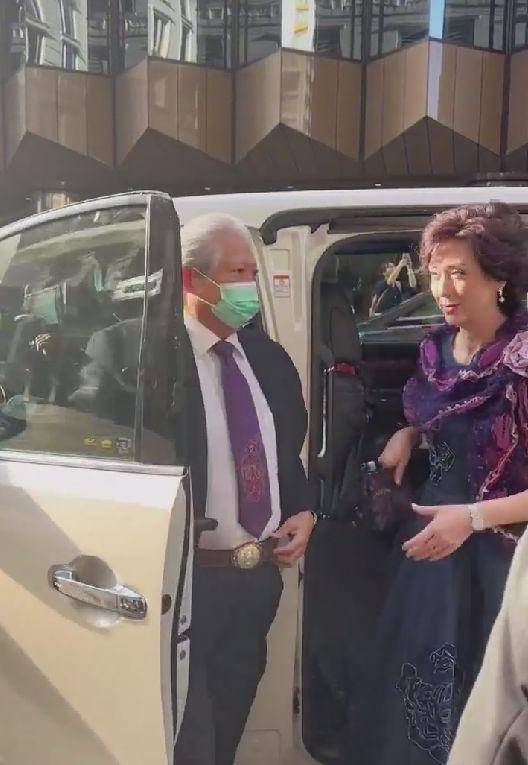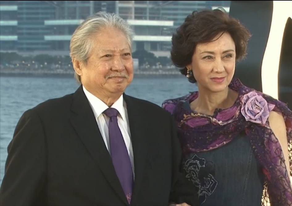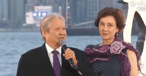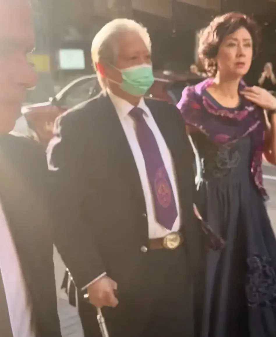 不過值得一提的是洪金寶戴了一條紫色領帶,這條領帶和妻子的紫色披肩互相呼應,顯然是精心挑選之后的搭配。