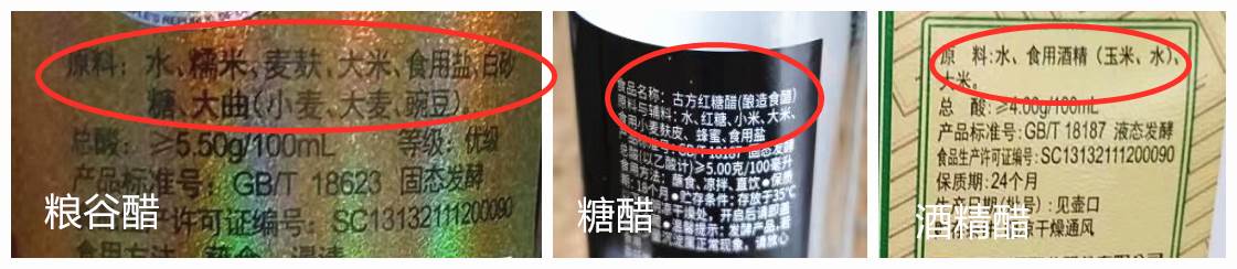 最左邊的食醋配料表裡,除了「水」以外,排在最前面的是「糯米、麥麩、大米」等,因此我們可以判斷出這是糧穀醋。而最右邊的食醋配料表裡,排在前面的釀醋原料為食用酒精,因此這瓶醋毫無疑問,屬于酒醋。
