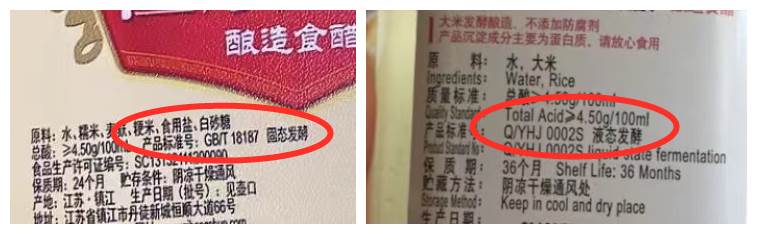 選購食醋時,要看的第二行字,就是醋瓶上標明的發酵方式,固態發酵醋的顏色較深,口感更醇厚,液態發酵醋的顏色較淺,口感相對清淡一些,根據個人需求選擇即可。