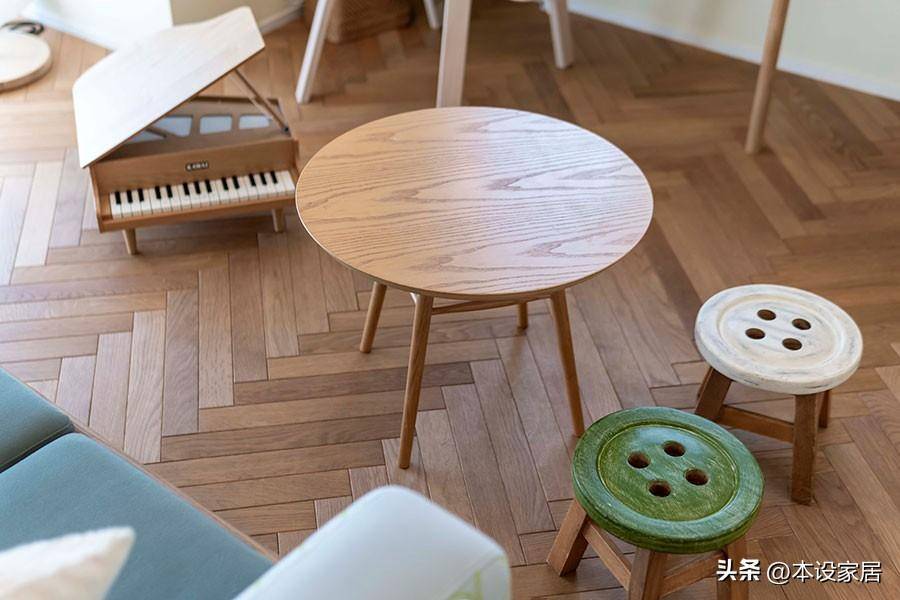 兩個女在客廳里畫畫、玩耍,紐扣式設計的座椅搭配實木圓桌,超級可愛,讓童年的生活,每一分每一秒都充滿了樂趣。