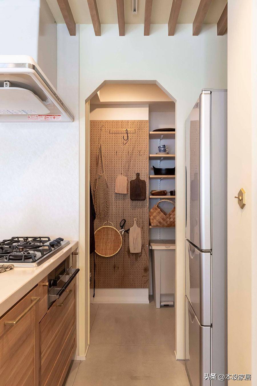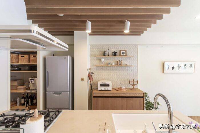廚房的旁邊設計了一間約2.5㎡的儲藏室,將廚房電器和五谷雜糧等物品整潔有序地納入其中,看著都很養眼。
