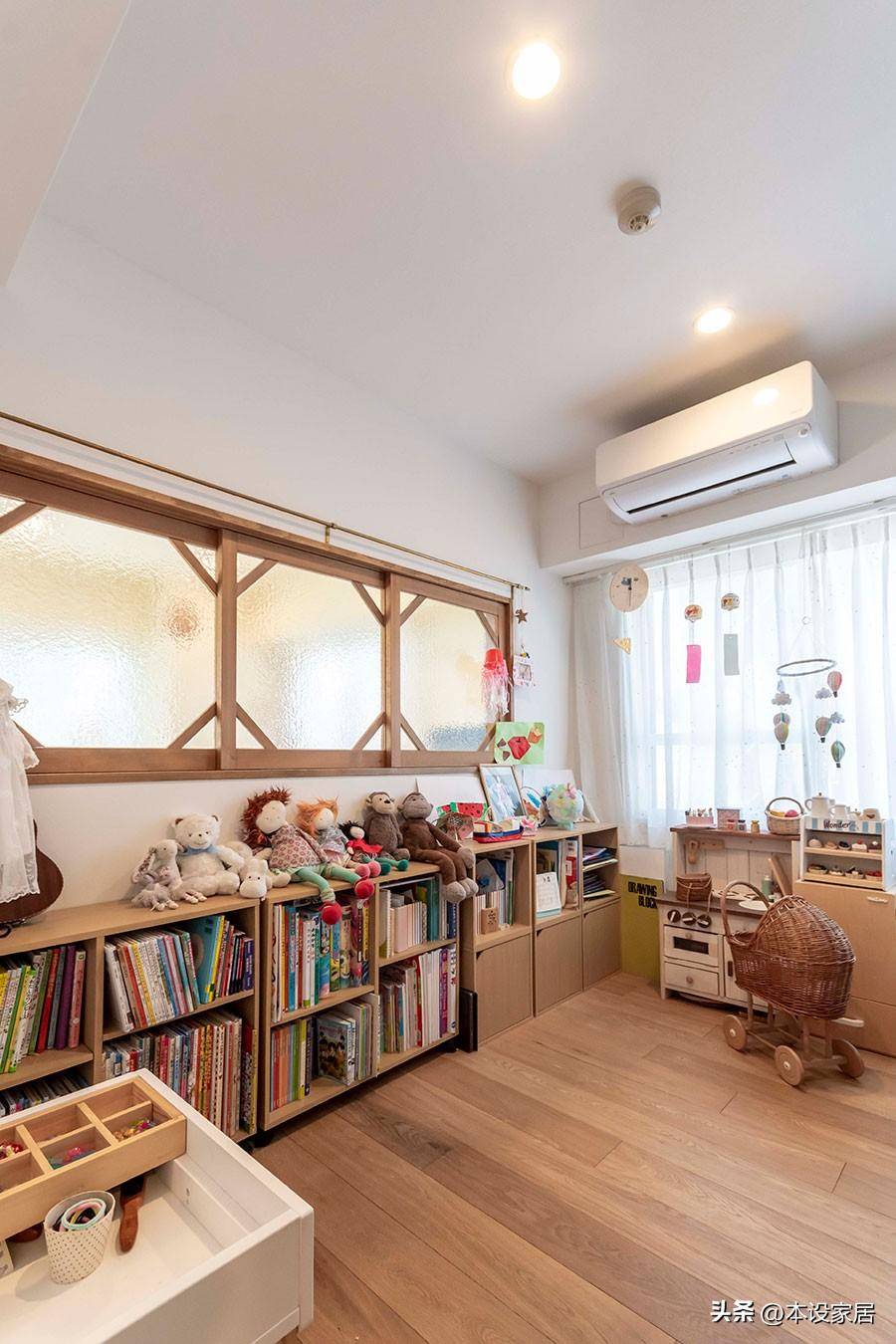 兒童房里各種書籍和玩具靠墻擺放,中間留出空間作為玩樂區,良好的采光,讓每個角落都充滿童趣,太幸福了。