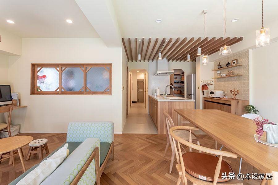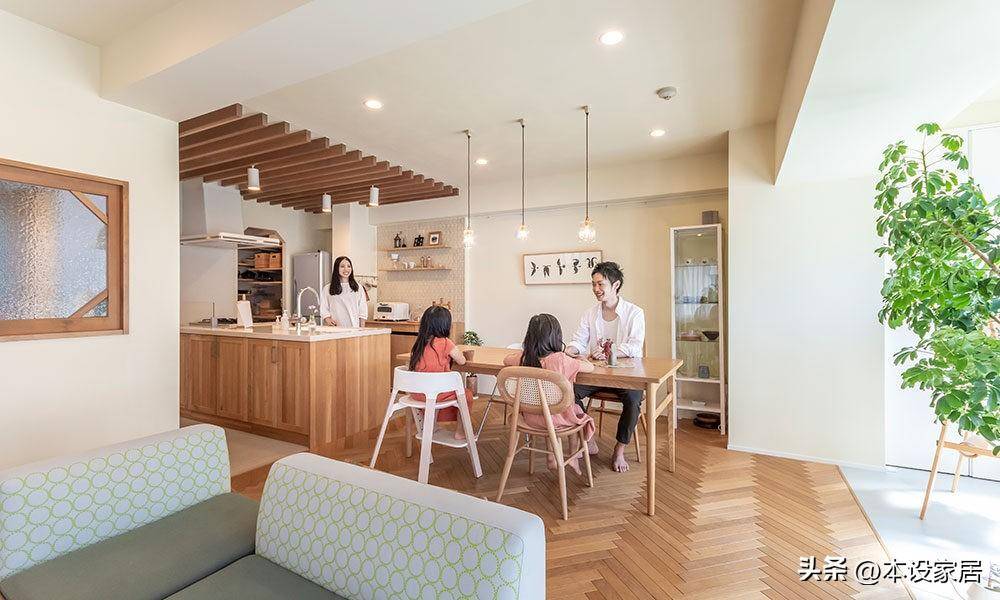 南面采光比較好,LDK一體,廚房連著餐桌,餐桌緊鄰沙發,井然有序,方寸之間滿足了一家四口的全部生活。