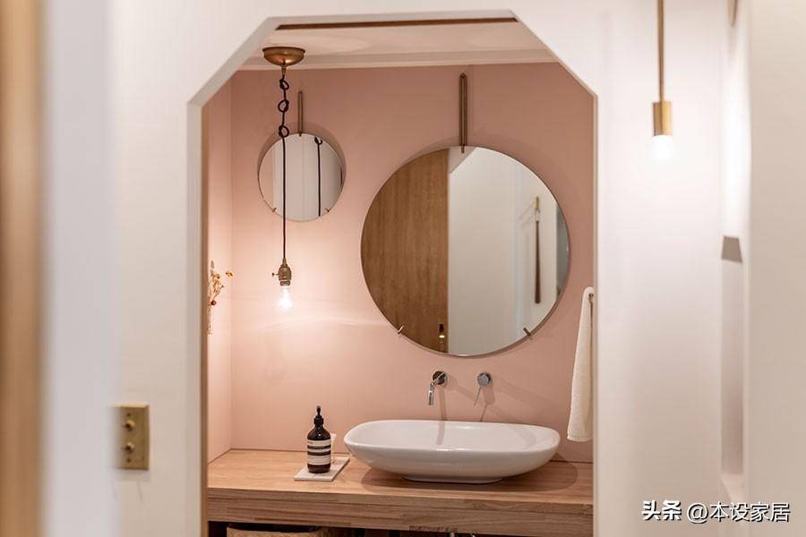 洗漱台的布置得恰到好處,沒有多余的造型和裝飾,墻面刷現在非常流行臟臟粉漆,洗漱用品收到藤框里,台面只需一瓶洗手液,整整齊齊,非常的實用。