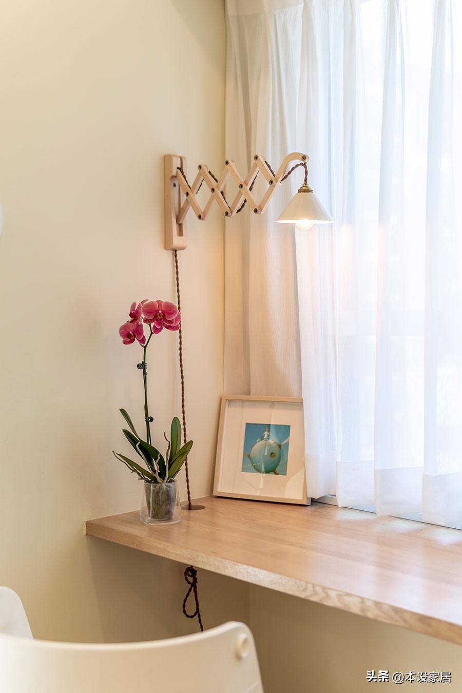 墻面上安裝了一盞可伸縮的壁燈,與小綠植和裝飾畫,圍合出一個精致溫馨的角落。