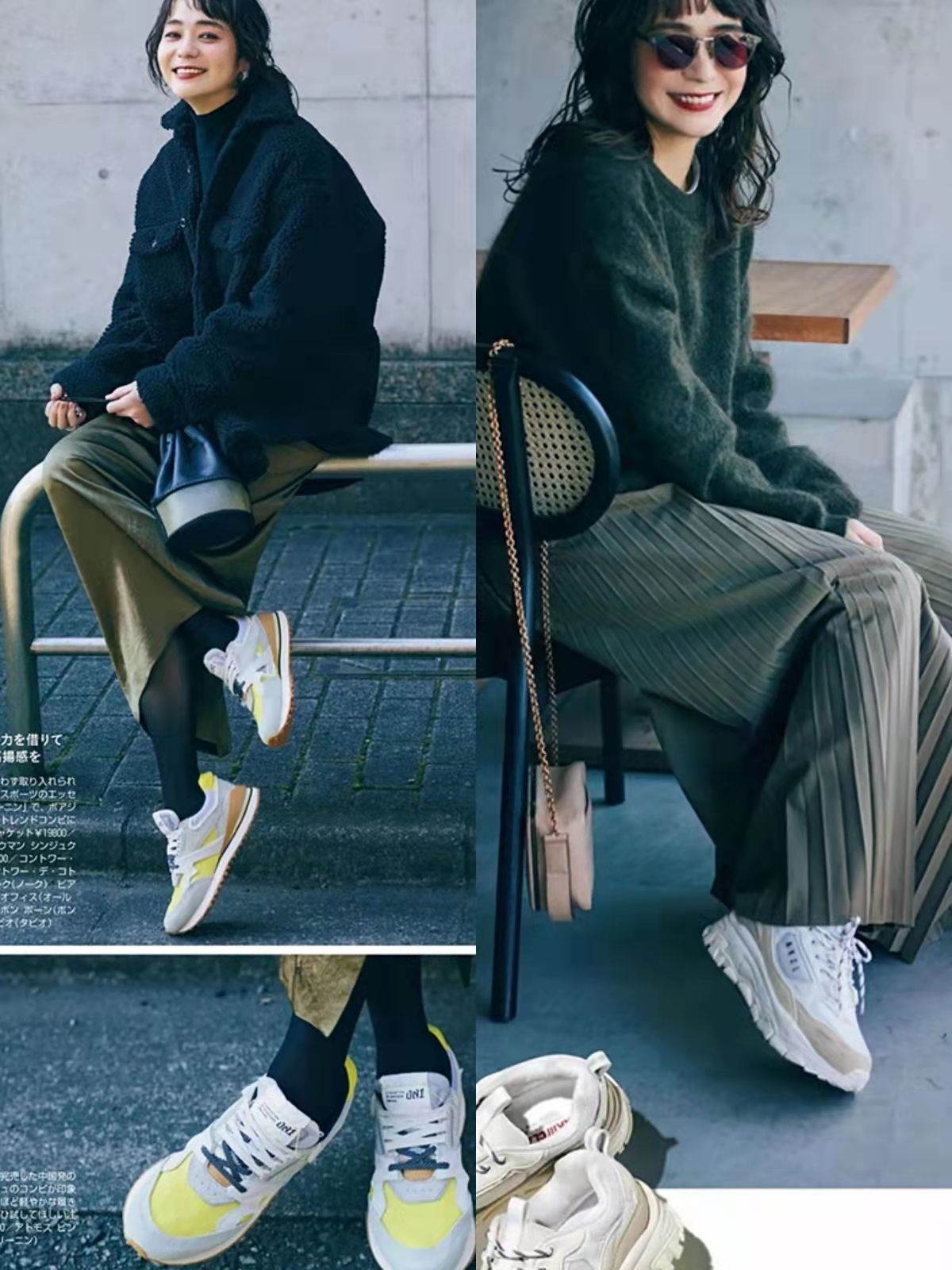 如果是傘裙、百褶裙或者闊腿長褲,推薦選擇小白鞋或者老爹鞋,減齡時髦又不會重心不穩。