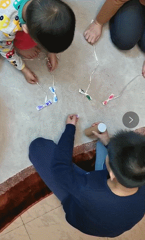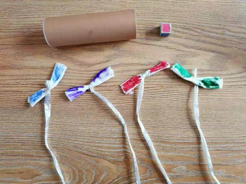 用繩子綁住一塊紙巾,再用水彩筆給紙巾涂上顏色,充當小老鼠。