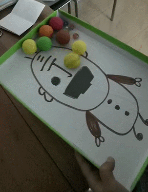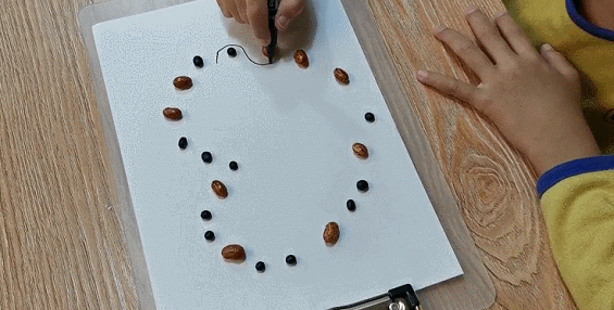 上面不是準備了一堆豆子嘛,把它們任意擺放在白紙上,讓孩子用筆繞著豆子畫線,不能碰到豆子就行。這個游戲鍛煉的是手腕控制和視覺專注能力,對孩子以后寫字靈活手腕手指有幫助。