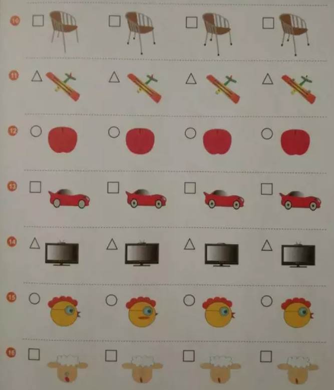 市面上有不少這種「找出不同圖形」的練習冊,可以買一些回來和孩子一起找找看,大部分孩子都會喜歡玩,完全不像是在做題,而是在闖關的感覺。