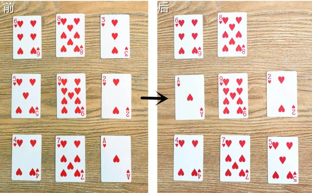 利用撲克牌,拿出1~9,隨意擺放,讓孩子觀察并記住這些數字的位置;讓孩子轉過身去,把個別數字交換位置或者取走,再讓他轉回身來,說出哪個數字變了位或者已被取走。