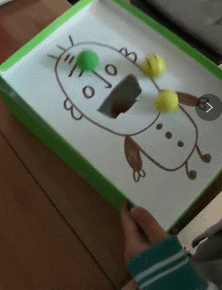 同時在丁老頭的嘴巴和眼睛處開口,其實是增加了游戲的難度。控制力好的孩子可以讓他們同時滾大球和小球,規定大球只能從嘴巴進,小球只能從眼睛里進。很考驗專注力、反應能力和手眼協調哦。