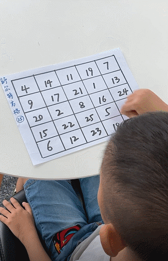 玩的時候,讓孩子用手指按 1 ~ 25 的順序依次指出其位置,同時誦讀出聲,每次玩的時候記錄時間,數完 25 個數字所用時間越短,注意力水平越高。