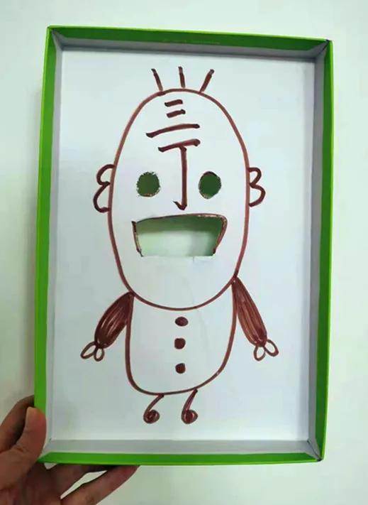 在鞋盒蓋上畫一個丁老頭,嘴巴開一個大口,兩個眼睛開兩個小口。