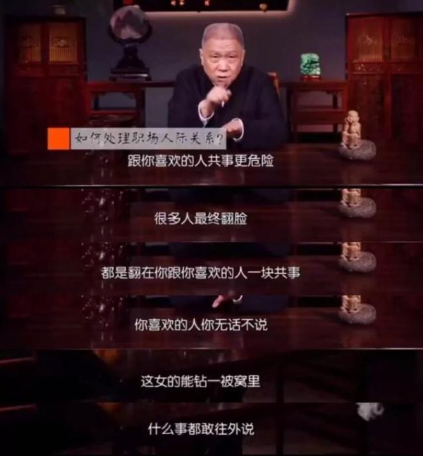 白手起家,中國第一間的私人博物館主人 馬未都說:「跟你喜歡的人共事,這不是能耐,這更危險。很多人最終翻臉、翻車都是翻在你跟喜歡的人一起共事上。你喜歡的人你就無話不說,尤其是女的,這女的能鑽一個被窩裡什麼事都敢往外說。