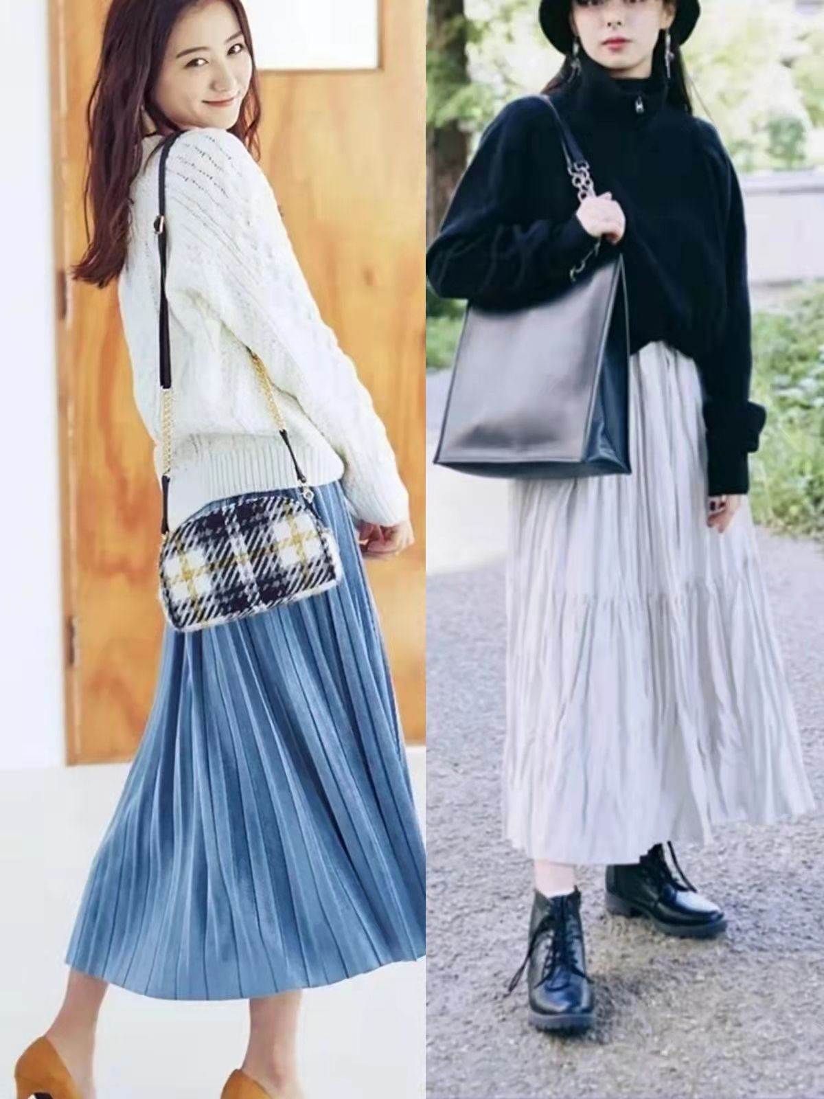 你可以用小白鞋搭配過膝裙,顯得溫柔大方,用馬丁靴搭配過膝裙,又甜美又帥氣,風格對比鮮明但又非常協調。