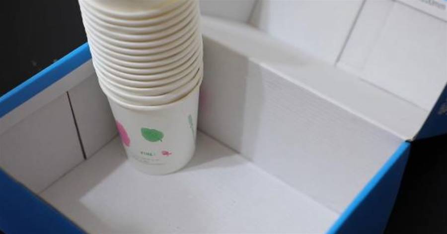 先將準備好的一次性紙杯放進鞋盒里面,如下圖所示這樣即可,然后用剪刀將鞋的蓋子邊緣處剪掉,再在鞋盒蓋上戳兩個小洞,這樣鞋盒就改造好了。