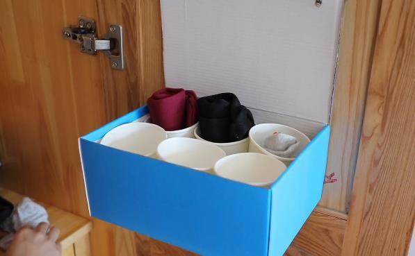 我們可以把它粘在衣柜上,如下圖所示這樣用兩個掛鉤固定住,再用膠帶粘牢固就可以了,這樣一個用一次性紙杯和鞋盒改造成的收納盒就做好了,用它來收納襪子是不是很實用呢?